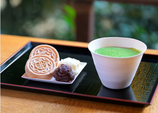 菊花壇展を鑑賞した後は、翔天亭で甘味処あのんの「生菓子抹茶セット」や「あんぽーねソフト」を味わった。