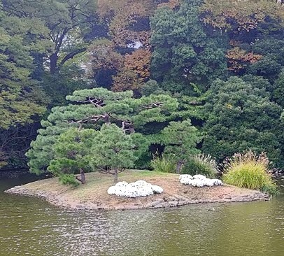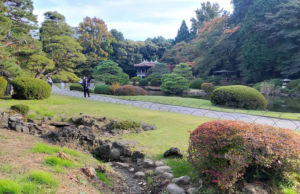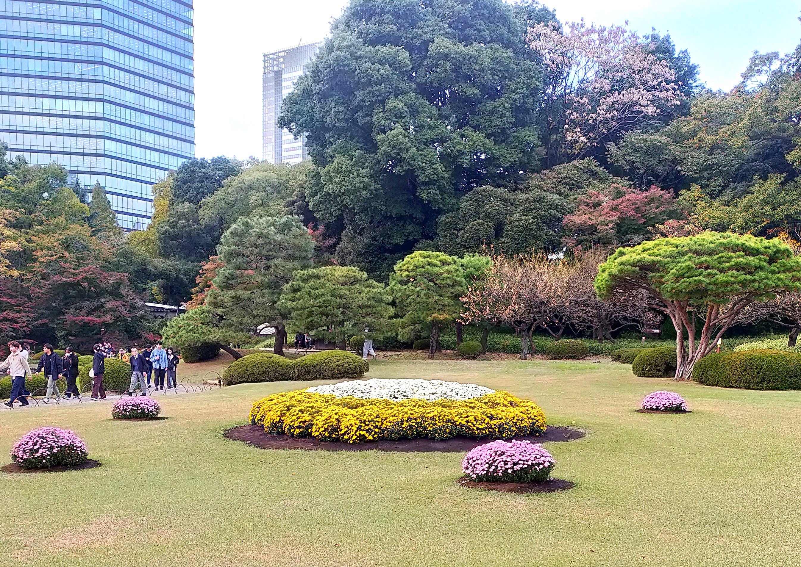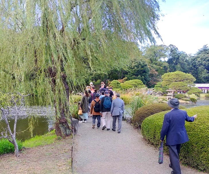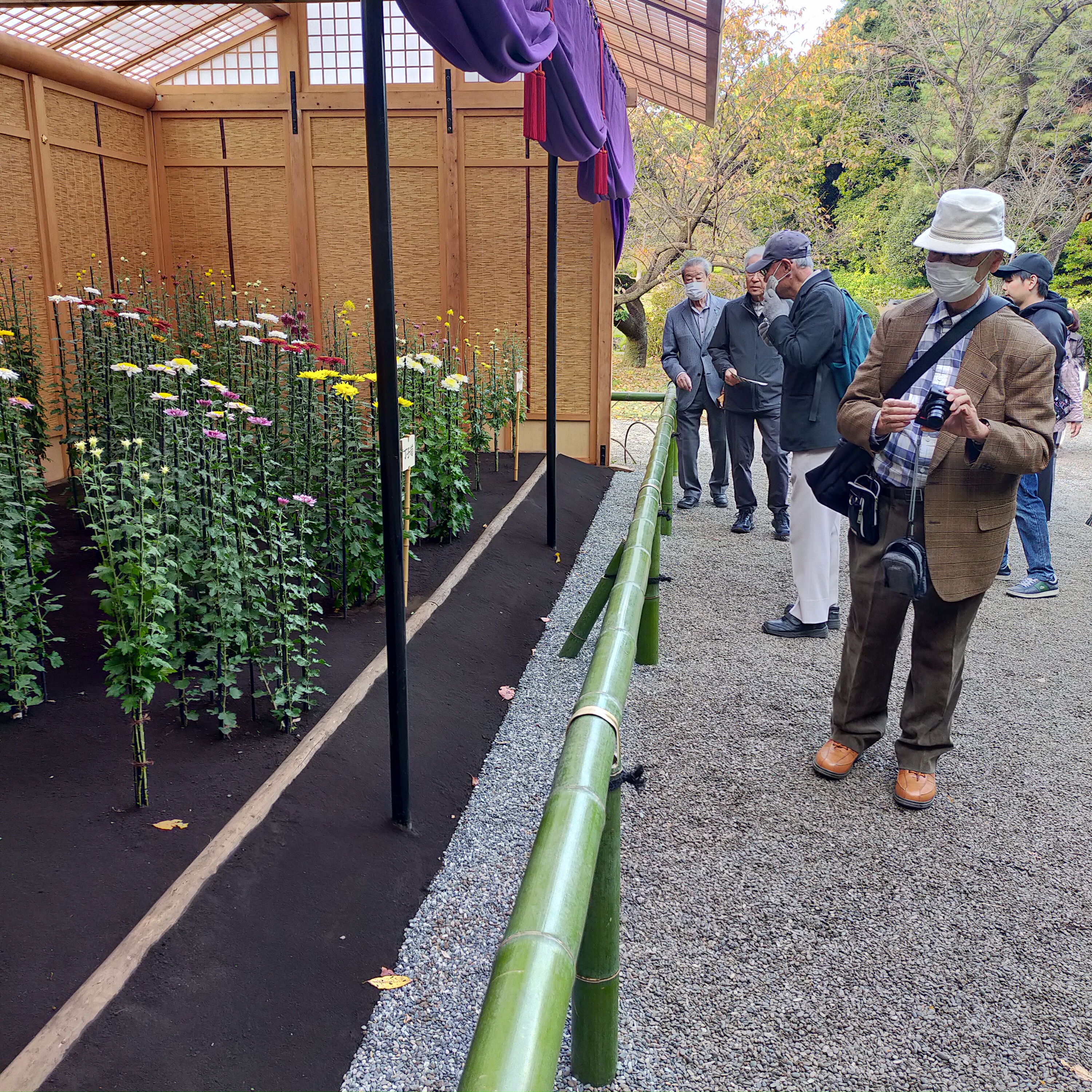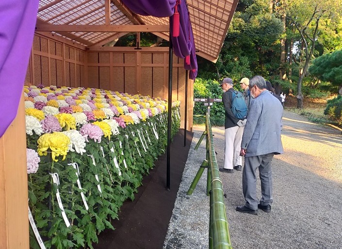 菊を観る会は2025年11月7日(金)午後2時に新宿御苑新宿門に集合し、参加者は7名となった。当日は晴天に恵まれ、新宿門から日本庭園へ向かう途中の芝生ではあちこちで入園者たちが団欒を楽しんでいた。