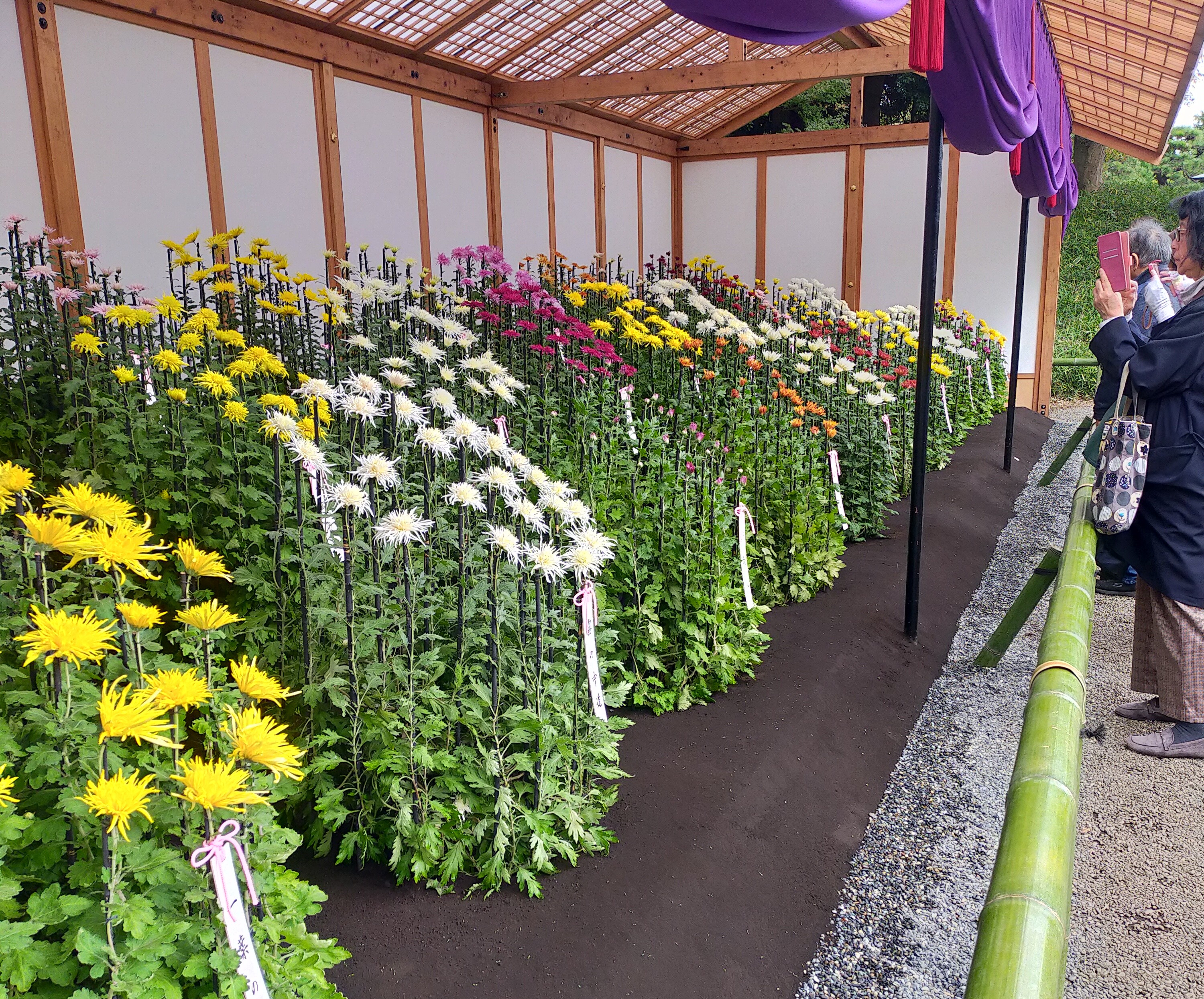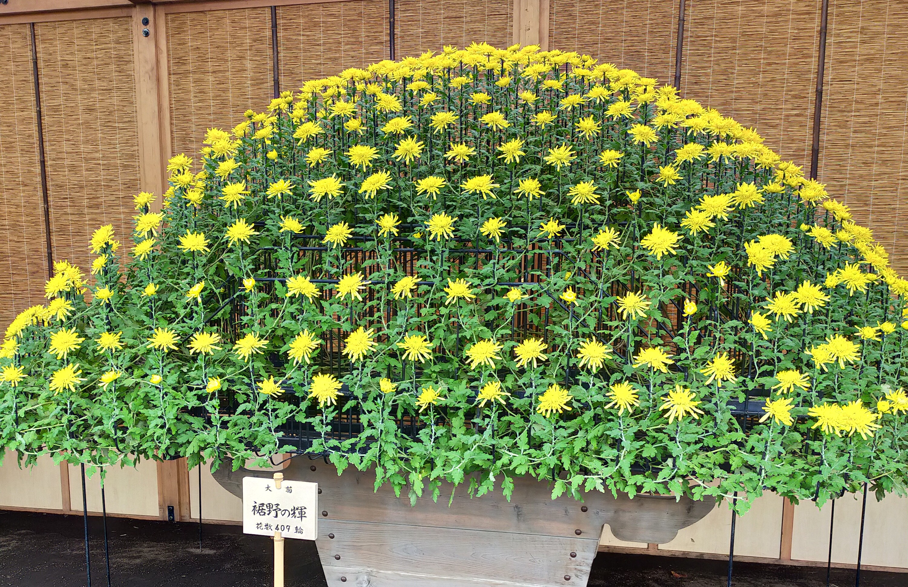 中でも新宿御苑独自の技法で作られる豪華絢爛な大作り花壇は今年は大菊5株(『裾野の月』3株と『裾野の輝』2株)が展示され、花数は1株280〜409輪だった。多い年は1株600輪以上の花を咲かせるが、係員によれば、初冬に出る芽から1年がかりで枝数を増やしていく過程で今年は異常な暑さのため十分な枝数を確保できなかったという。その他、伊勢菊、丁子菊、嵯峨菊、江戸菊、一文字菊、管物菊、肥後菊の花壇や懸崖作り花壇も見事だった。