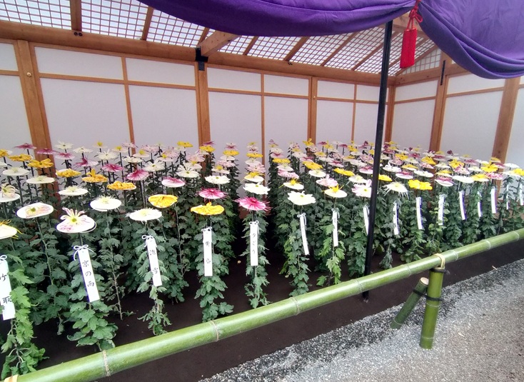 我々は順路に沿って7か所の上家に展示された各種菊花壇や芝生などに展示された路地(露地)花壇を鑑賞した。