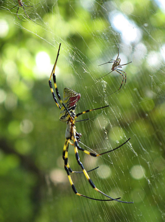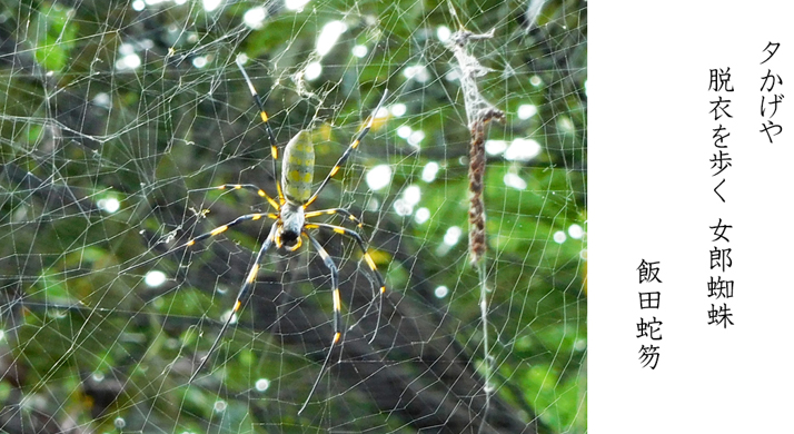 近くのニュータウンの中をウオーキングをしているとき、路傍の木と木の間を差し渡すように蜘蛛が大きな巣を張っていた。何という蜘蛛なのか分からなかったが、調べてみると女郎蜘蛛だと分かった。女郎蜘蛛は夏から秋にかけて大きな網を張る蜘蛛である。クモ目ジョロウグモ科ジョロウグモ属に属する蜘蛛である。