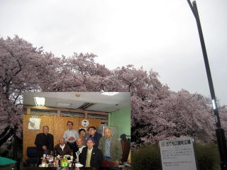 ![]() 今年度の花見の会は、開始予定時間の12時になっても雨が止まないので、止むを得ず、場所を室内に移して行われました。本会には、曇天のせいもあっておよそ9人が集まり、和気あいあいと楽しい時間を過ごしました。添付の写真(及び表紙の写真)は、当日の小金井公園の桜の模様を撮った写真に別途室内で撮った参加者の写真を合成したものです。 |