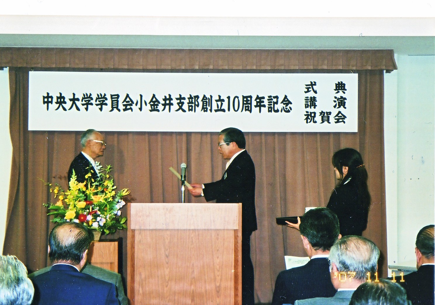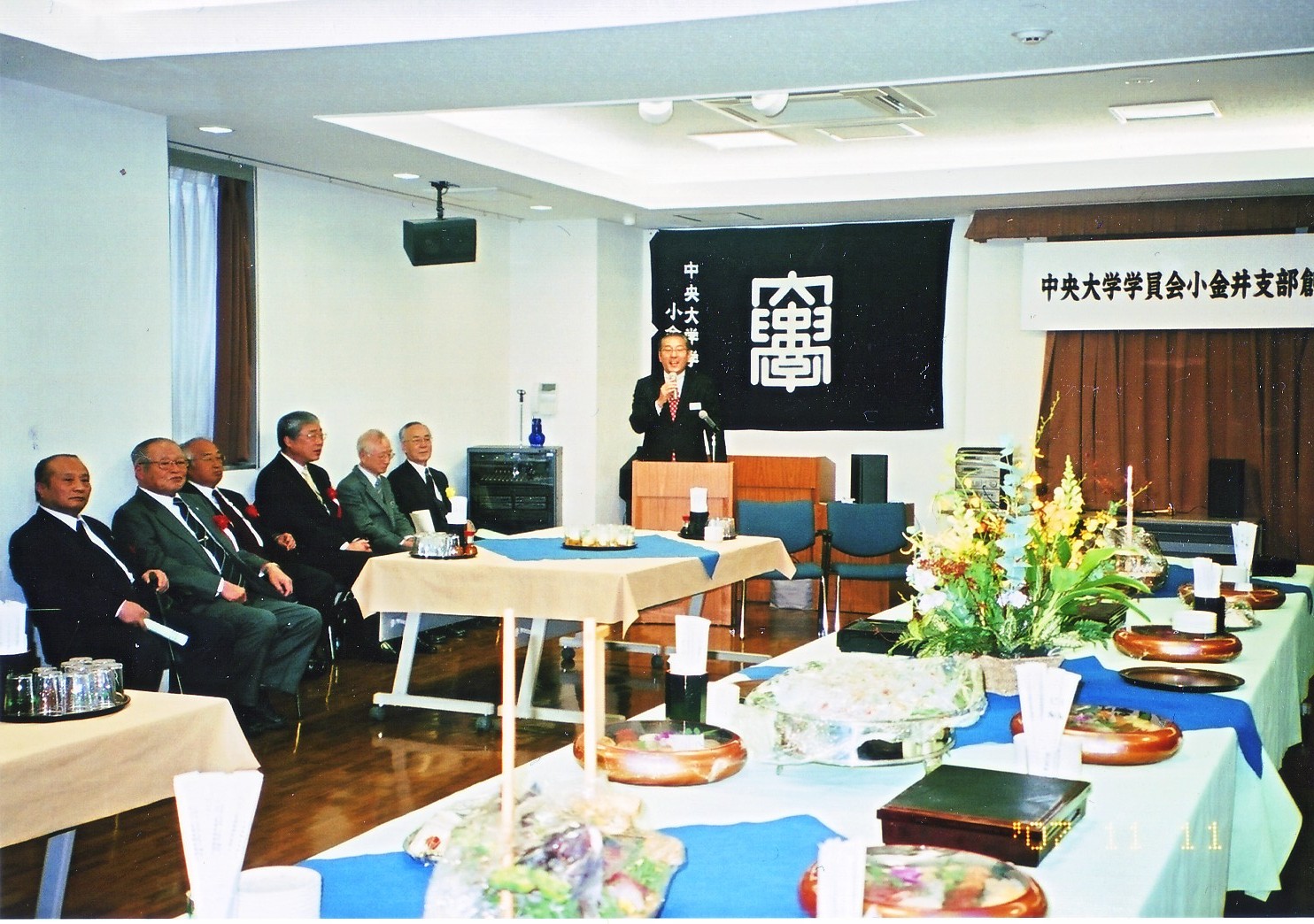 去る11月11日(日)13:00から来賓19名・会員33名、合計52人の方々の参加を得て盛会に行われた。 先ず、「記念式典」は、会員渡辺大三氏の司会進行により、予定より若干遅れて午後1時10分頃より開始された。同氏による開会の辞の後、今年亡くなられた藤川行夫氏・渡辺清氏を含む物故会員のために黙祷が行われた。その後、本記念式典の実行委員長伊藤隆文氏および支部長斉藤芳司氏の挨拶を経て、三人の来賓の方々(①小金井市長稲葉孝彦様、②中央大学常任理事出口純輔様、③中央大学学員会会長久野修慈様)より祝辞を賜った。次に、「特別功労者表彰」が行われ、小金井支部設立以来、最初の8年は幹事長、最近の2年は支部長として常に会の中心的役割を担って来られた斉藤芳司氏が表彰された。続いて、支部設立当初から会員で且つ年会費を払い続けて頂いた26名の方々に「感謝状・記念品贈呈」が行われた。最後に、渡辺大三氏が「閉会の辞」を述べ、記念式典は無事終了した。
