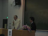 12:00、小金井支部テントの前で、三々五々会場へ来ていた小金井支部メンバーの方が集まりそこで写真を取りました。同写真⇒[本年度の活動]参照 その後、邉田さんご夫妻と私は、当日の目玉エベントとも言うべき、『対談―蓮池薫氏、恩師と語るーテーマ「母校への思いを語る!』(3号館5階、3552号教室)を聞きに行きました。教室内は、既に満杯の状態で、座席が取れない状態でしたが、幸いなことに、白門41会(小生、邉田さん共に、昭和41年卒)の面々がかなり前の方に席を取っておいてくれたので、3人とも座ることができました。左の写真(2枚)は、蓮池薫氏と彼が北朝鮮から解放された後、中大に復学したとき、新潟県柏崎市の彼の自宅まで赴いて、集中講義をした長内了法学部教授(英米法)です。因みに、長内氏は、小生と同期で、白門41会の会長でもあります。 |