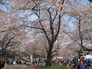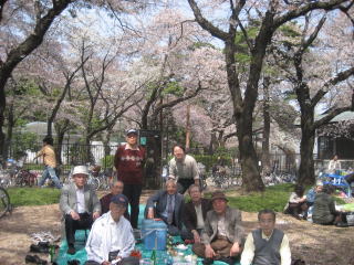 平成20年4月5日(土) 正午よりいつもの通り小金井公園江戸東京たてもの園前広場にて花見会が開催されました。当日は天気に恵まれ、風に散った桜花が酒盃(グラス)の中に降り注ぎ、桜見ならぬ「桜酒」(?)を堪能しました。 |