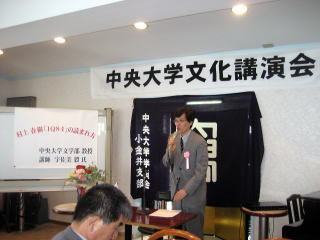 第1部の文化講演会は、「村上春樹『1Q84』の読まれ方。」と題して、中大文学部教授宇佐美毅氏にお話頂きました。宇佐美先生によれば、村上春樹は、これほど読まれた日本人作家はいないとのことで、読者数は、ノーベル文学賞作家である川端康成や大江健三郎以上とのことでした。ストーリーは、天吾(と称する男性)と青豆(と称する女性)の恋愛に焦点を当てながらも、地下鉄サリン事件やアメリカ同時多発テロ等について縷々論じているとのことで、実社会に入ってから、本と言えば、専ら実務書中心で来た筆者にとっては、よく意味の理解できない内容でした。 |