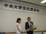 ![]() 講演会終了後、中大付属高校生の清水千尋さんからの花束贈呈 |