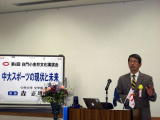 ![]() 文化講演会は、午後1時30分〜3時30分の間、「中大スポーツの現状と未来」と題して、中央大学文学部教授(スポーツ社会学)の森正明先生にお話頂きました。 先生のお話の骨子は、以下の通りです。 中大の場合、(スポーツクラブを含み)課外活動クラブは、「学友会」を中心とした学生の自治に委ね、「学生部」(大学側の組織)は、それ程、それに深く関わって来なかった。その結果として、スポーツ施設が貧弱で、自由に使えるプールやグランド、トレセンが皆無に近い状態であった。しかし、近年、強化部を大学内に設置し、駅伝を特別強化チーム、硬式野球と水泳を強化チームに指定し、これらを所謂「強化3部」として、大学側がこれの強化に力を入れることになった。これにより、今年の悲しい箱根駅伝のように、シード権を逃すようなことはなくなるであろう。 |