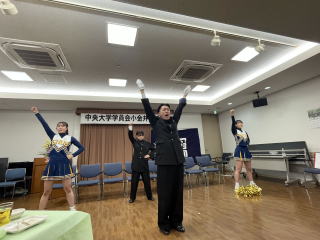 第3部の懇親会は、清水学幹事の司会の下、先ず、校歌斉唱から始まり、小金井市長白井亨氏を初めとした賓の方々ご祝辞の後、中大学員会副会長 榎秀郎氏の乾杯で宴会が始まり、皆さん三々五々、歓談され、会の最後では、中央大学応援団(現役)のエールを得て、応援歌、惜別の歌を歌い、楽しいひとときを過ごしました。 |