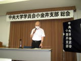 ![]() ![]() 第2部の第27回小金井支部総会は、関口和仁幹事の司会の下、小金井市長(白井亨氏)、小金井市市議会議長(宮下誠氏)、中大法学部教授(只木誠氏)、中大常任理事(中島康代氏)、中大付属中学・高等学校校長(石田雄一氏)、中大学員会副会長(榎秀郎氏)、調布、府中、小平、国分寺、各支部の支部長および代表の方々のご臨席の下、多数の学員が参加して執り行われました。議案はすべて満場一致で承認されました。 |